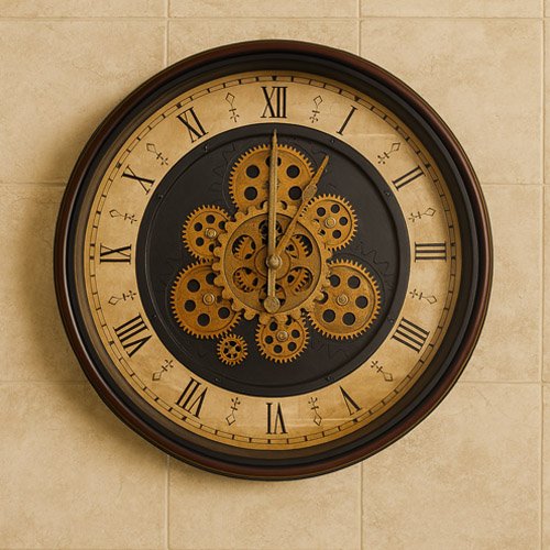 Beige Wall Clock with Black Roman Dial, Golden Moving Gears, and Brown Rim